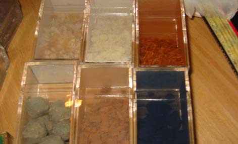(clockwise from top left) Gum Arabic Crystals, Sanderac Crystals, Brazilwood, Oak Gall, Madder Root, Indigo