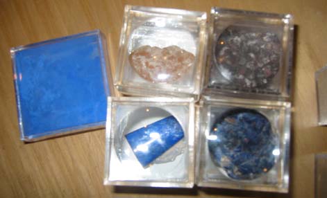 (clockwise from left) Ultramarine Lapis, Gum Arabic, Cochineal (bugs..they make a bright fuschia color!), Lapis Lazuli, and Polished Lapis